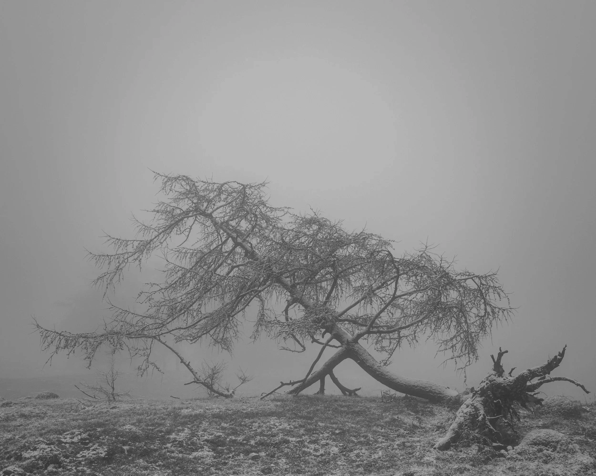 Every now and then, as the light begins to fade and the sun sets, conditions are just right and a thick fog decends on a landscape local to me. This rough and cluttered hilltop is a former 18th century Larch plantation which was felled during the Second World War to meet the timber shortages. What remains are small groupings, new volunteers and single stand alone trees. When out hiking on this high ground and caught out with rapidly diminishing light and visibility, one begins to feel disorientated. A background anxiety builds as a childlike fear of being lost sets in. At times such as these I find myself anthropomorphising these larch trees as if they are familiar characters in a story. They become friends in the fog and the unique form of each tree acts as a way marker, guiding me back to the safety of the car before darkness falls. The few times I have been fortunate to experience these conditions I have had my camera with me.